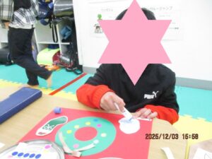 まずは、リースにペタペタ丸シールを貼り、微細運動を高めていきます👆➚