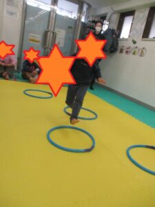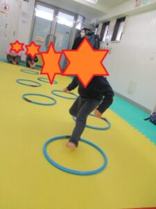 幅跳びの練習 → フープを使って片足ジャンプを行っている様です!