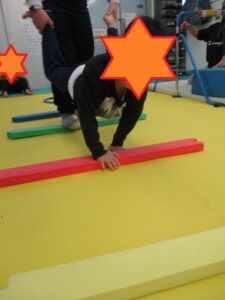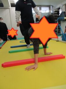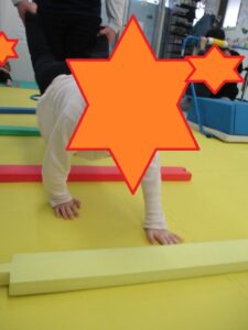 腕をしっかり伸ばす練習 → 足じゃんけんとスズメの練習に手押し車を行っている様子です!
